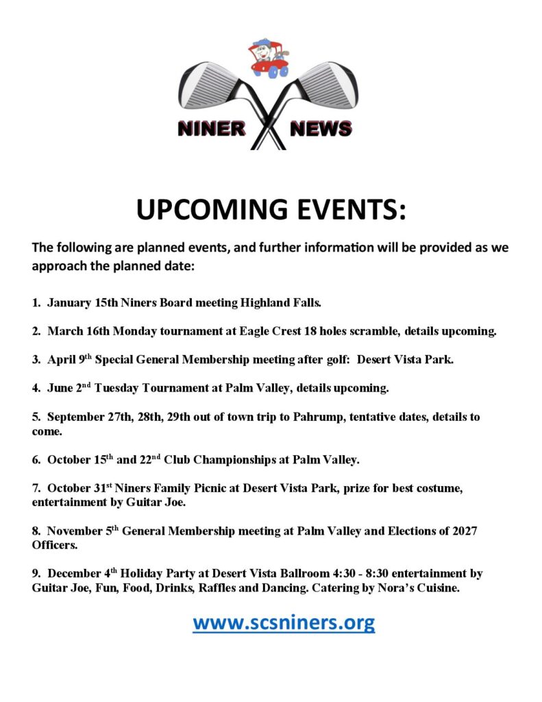 We are primarily a social club that plays golf for fun and enjoyment.The Sun City Summerlin Niners have activities throughout the year, in addition to our weekly tournaments. We have local and out of town events, and our traditional December Holiday Dinner and picnics throughout the year.Please see below for News and Upcoming Special Events: